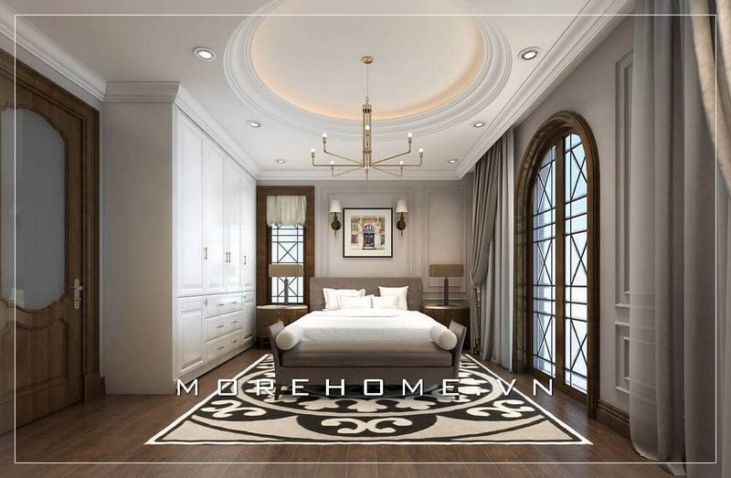 Tủ quần áo gỗ tự nhiên màu trắng sang trọng và tinh tế, lối thiết kế kịch trần tạo cho căn phòng thêm cao và thoáng hơn